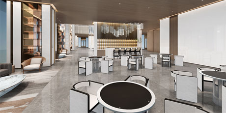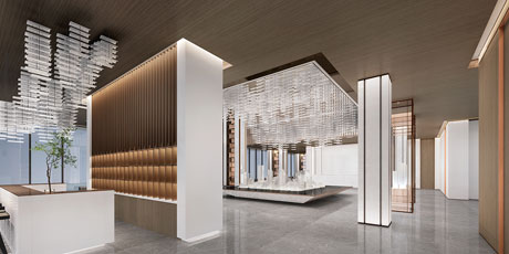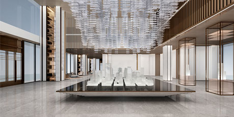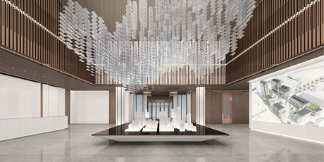 售樓處功能區分散在整個(gè)空間中,形成流暢清晰的循環(huán),平衡了隱性和顯性之間的關(guān)系,在布局中也融入了未知和交互,以留出更多的想象空間。未知刺激下的人與靜態(tài)物品的互動(dòng),可以為空間注入活力。整個(gè)空間營(yíng)造 出簡(jiǎn)約的空間基調。帶有紋理的大理石和木制藝術(shù)裝置被引入,以減輕廣闊空間的空虛感??臻g中的物品與自然和藝術(shù)相連。只有在與人互動(dòng)時(shí),他們才能開(kāi)始扮演角色。淺色調平衡了建筑結構的厚重感,也豐富了空間 的層次感。入口處下沉的燈飾結構打破了空曠感,同時(shí)也豐富了視覺(jué)體驗。水吧、休息區和洽談區緊密相連,共同形成社交的錨點(diǎn)。整個(gè)售樓處以藝術(shù)美學(xué)和極簡(jiǎn)主義為特色,激發(fā)人們與自然的互動(dòng)。